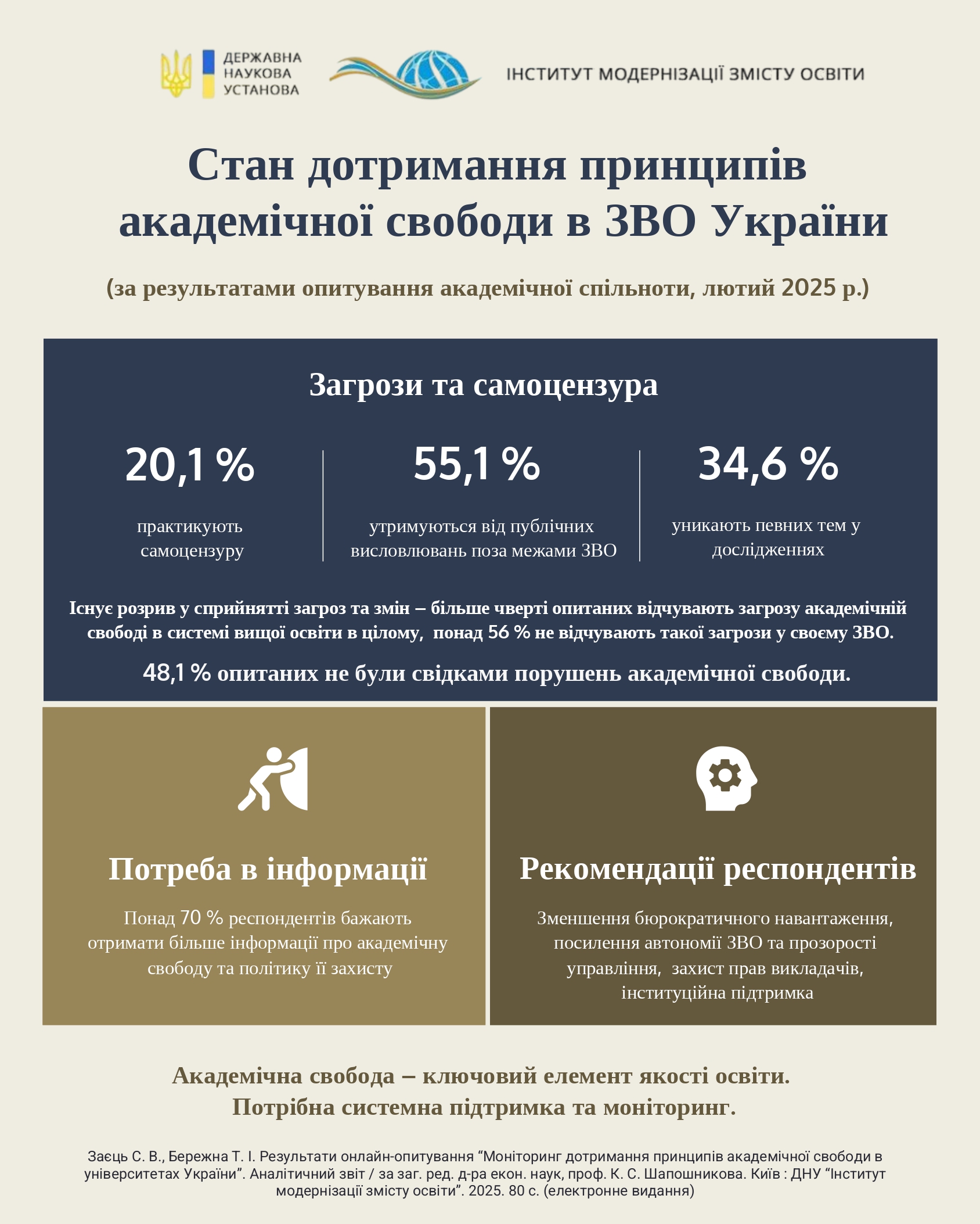 У лютому 2025 року Державна наукова установа «Інститут модернізації змісту освіти» в рамках виконання НДР «Впровадження університетської автономії в контексті децентралізації управління ЗВО, демократизації освітнього процесу, підвищення відповідальності за якість освіти» у співпраці з Центром академічної досконалості та етики в освіті «Етос» провела опитування на тему «Дотримання принципів академічної свободи в університетах України».