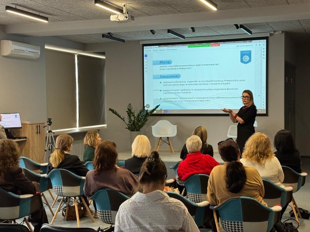 Презентувала учасницям основні результати гендерного аудиту, який був проведений в Університеті у 2025 році та результати розбудови політики забезпечення рівних прав та можливостей жінок і чоловіків за п'ять місяців потому – проректорка з науково-педагогічної роботи та інноваційного розвитку, уповноважена з гендерних питань Університету, Алла Шлапак.
