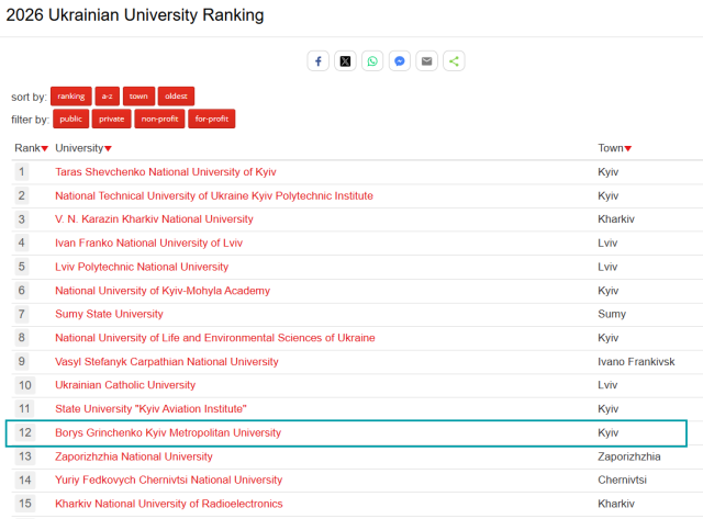 Київський столичний університет імені Бориса Грінченка вчергове підтвердив свій динамічний розвиток, продемонструвавши зростання у престижному світовому рейтингу uniRank (University Ranking) 2026. За результатами міжнародного дослідження Університет не лише зміцнив позитивну тенденцію, увійшовши до ТОП-15 найкращих закладів вищої освіти України (12 місце з-поміж 189 ЗВО), а й покращив свій попередній результат на 4 позиції. Серед київських університетів за показниками популярності та впливу в мережі Університет посів 6 місце.