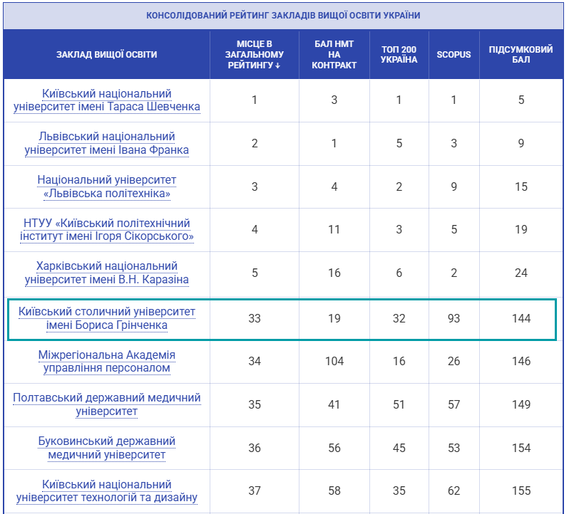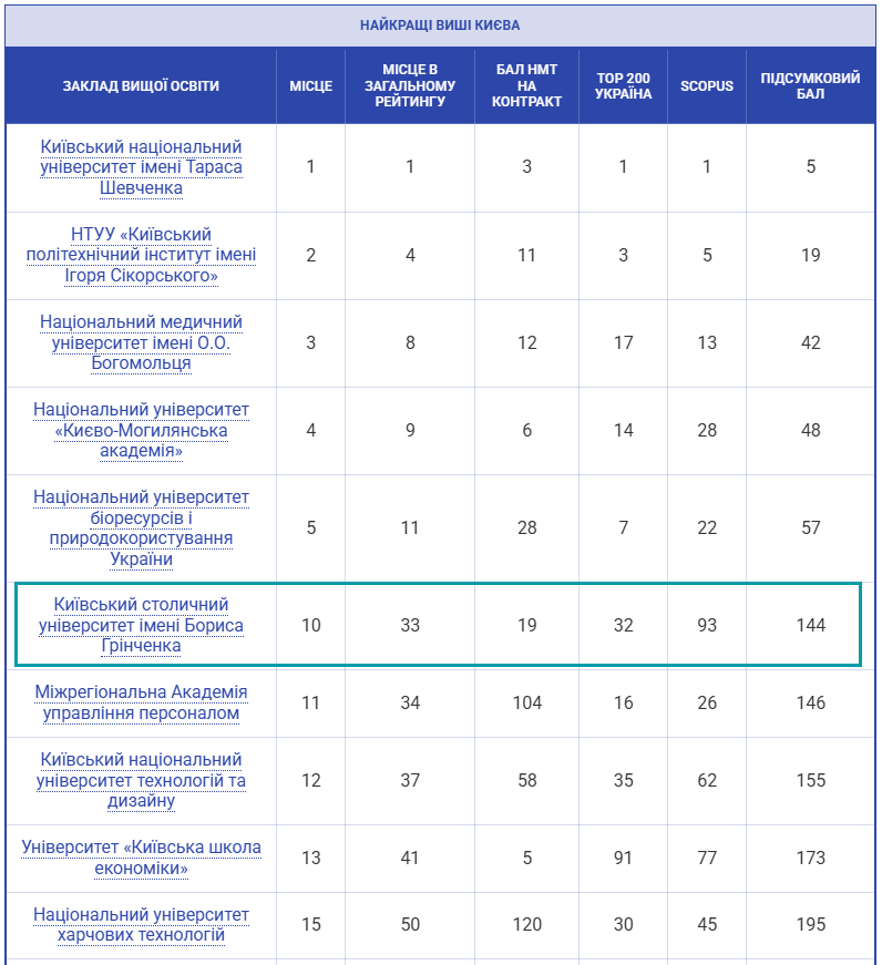 У рейтингу найкращих закладів вищої освіти столиці України Київський столичний університет імені Бориса Грінченка піднявся на 3 позиції та посів 10 місце з-поміж 72 закладів вищої освіти Києва, представлених у Консолідованому рейтингу закладів вищої освіти України 2025 року.