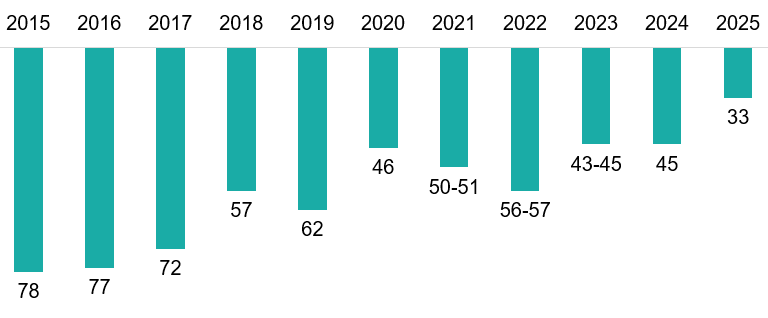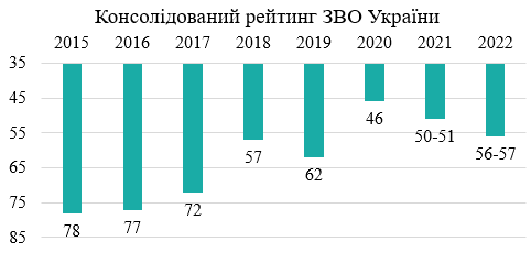 Порівняльна діаграма зміни позиції Університету Грінченка в Консолідованому рейтингу закладів вищої освіти України за період 2015 - 2025 рр.