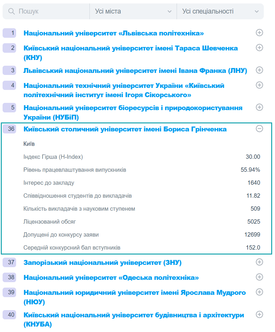 Фахівцями Education.ua щорічно формується рейтинг закладів вищої освіти України на основі аналізу відкритих офіційних даних про результати вступної кампанії, освітню, наукову та інноваційну діяльність закладів вищої освіти. Метою рейтингу є надання абітурієнтам, студентам, батькам і освітянам об’єктивного та зрозумілого інструменту для порівняння закладів вищої освіти й ухвалення зваженого рішення щодо вибору університету для вступу.