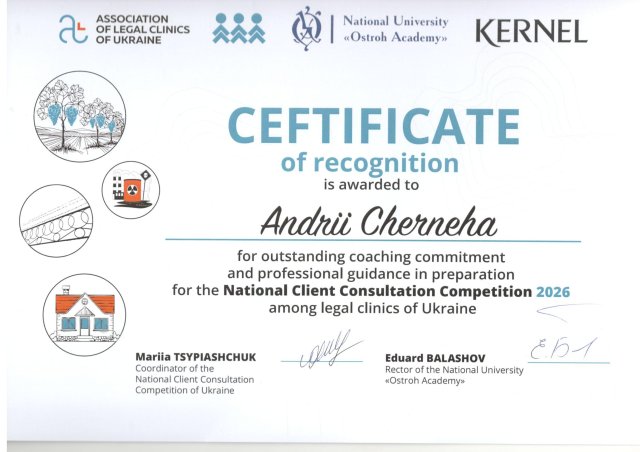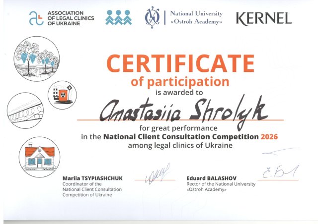 Команда ЮК «Астрея» Факультету права та міжнародних відносин Університету Грінченка взяла участь у ХІІ Національній Олімпіаді юридичних клінік з консультування клієнтів, організованій Асоціацією юридичних клінік України, за підтримки Національного університету «Острозька академія» та Агро холдингу «Kernel». Національна Олімпіада юридичних клінік з консультування клієнтів є попереднім раундом для участі української команди у Міжнародних Змаганнях з консультування клієнтів ім. Брауна-Мостена. Цього річ Олімпіада проходила 05-07 березня 2026 р. в Національному університеті «Острозька академія», м. Острог, Рівненської області. Метою олімпіади – є сприяння поглибленню знань й інтересів серед студентів-правників в галузях превентивного права й консультаційних функцій юридичної практики. Змагання допомагають розвивати навики інтерв’ювання клієнта, планування та аналізу, необхідні для майбутніх правників. Тема Змагань «Правові аспекти використання земель», що охопила інститути власності, оренди, спадкування, повноваження органів державної влади та місцевого самоврядування у галузі земельних відносин, спори що виникають у сфері права користування землею, цілком відображає проблемні аспекти запровадження земельної реформи в Україні, особливо коли у липні 2021 року був знятий мораторій на розпорядження землями сільськогосподарського призначення. Земельні відносини завжди знаходилися в центрі суспільно-економічного життя, потребуючи постійної уваги з боку державних і не державних інституцій, суспільства в цілому, належного правового регулювання питань володіння, користування та розпорядження землею, як основним національним багатством України, що перебуває під особливою охороною держави.